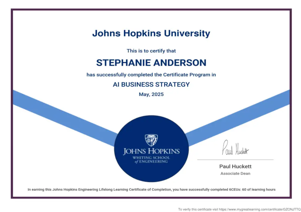 Stephanie recently received her “AI for Business Strategy” certification from Johns Hopkins University Whiting School of Engineering.